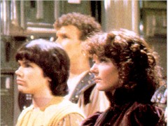 Tegan starts off bad but improves drastically. I know Joe Ford hates her with a passion, as seen in >a href=#7>his review above (I always love reading Joe's reviews, which I put down to his enthusiastic exclamation marks!), but I think her frantic desire to get the hell away from Monarch's ship in this story is brilliant and incredibly real. I sure know that I'd be desperate to leave if I knew that my host intended to kill me and create an android in my image. Her desperation and frustration are so broad as to be pisstakes, but they make Tegan one of the few cool characters in this story. She reminded me of the first Doctor in his "mean-spirited old ratbag" phase, particularly when the Doctor tries to get her interested in stopping Monarch and she replies "I don't care; I want to get back to the TARDIS and GET OUT OF HERE!" I laughed at that, because it's just not what you expected from a Doctor Who companion. And she must get points for beating up Adric before pissing off back to the TARDIS. Her desperation in the TARDIS is remarkably well-acted (considering how she starts the story). And, this being Janet Fielding, she manages to twist her child-friendly expletive "cripes!" into the pleasantly unexpected "Christ!"