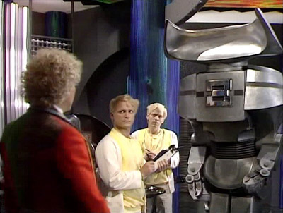 The trial bits become a bit annoying as the story unfolds, because the Valeyard's insinuations about the Doctor's behavior in this story are never matched by what happens on screen. The Valeyard accuses the Doctor of worsening the situation by his mere presence, but that's patently untrue. Drathro's "cullings" don't stop if the Doctor doesn't show up. Dibber still blows up the blacklight aerial and causes the inadvertent destruction of the [planet/galaxy/Universe] without the Doctor's arrival. But, on the other hand, if you delete the trial segments and just watch the Ravolox sequences on their own, the story is ten to fifteen minutes shorter... and is already lightweight enough that extra padding (as you can find in the deleted scenes on the DVD) wouldn't substantially help matters.
